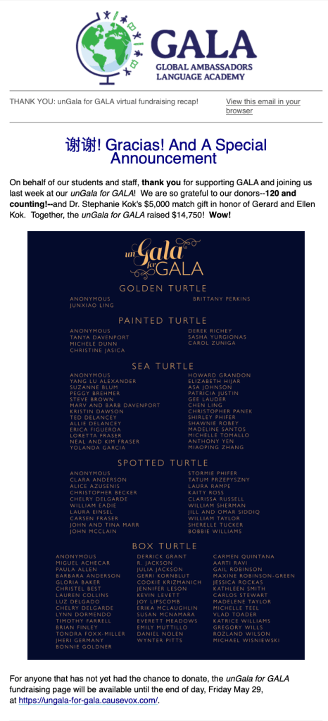 As schools look at a new and as yet unclear future, here’s a nice example from an immersion charter school in Ohio of how to do online fundraising. The GALA gala each year always sounded like a lot of fun (from seeing their emails). It’s impressive how they managed to capture some of their excitement online, not an easy trick.