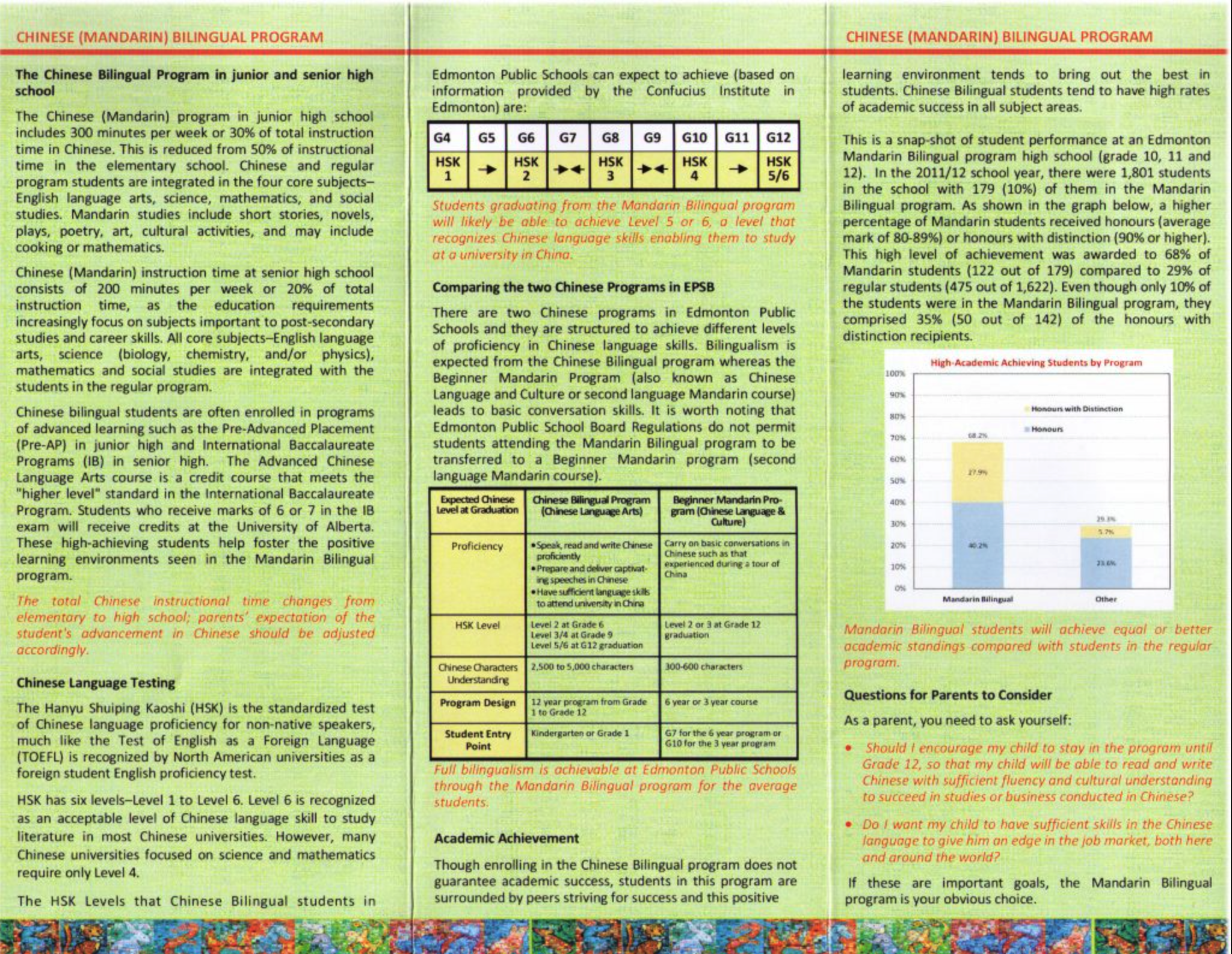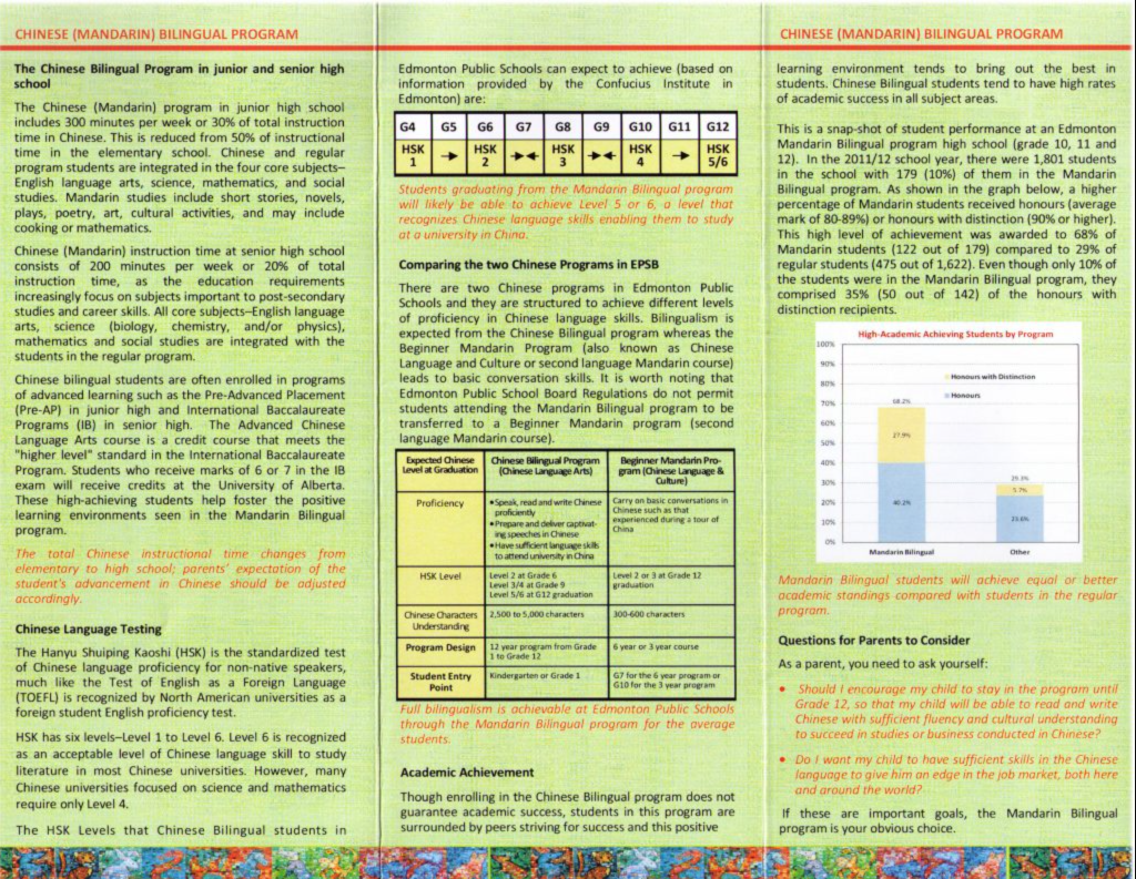 Edmonton Public Schools offers a Chinese Bilingual Program that graduates students students with a level of ability that would allow them to study in science and mathematics universities in China, according to the ECBEA.