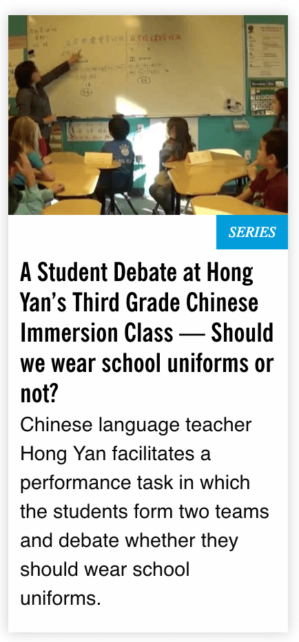 The Asia Society’s Center for Global Education has a nice page of videos showing teachers teaching in Chinese classes across multiple grades. Even if you don’t speak Chinese, it gives you a flavor of what goes on in these classes, with some English commentary on the teaching interspersed.